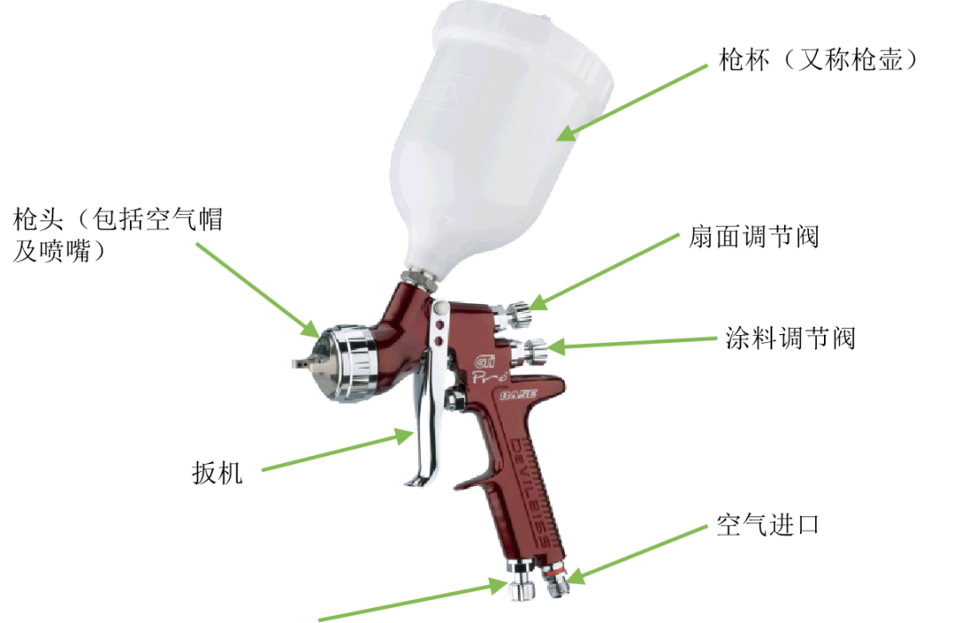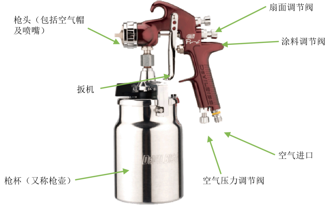 上圖為重力式空氣噴槍,其涂料罐位于噴槍的上部,涂料靠自身的重力與涂料噴嘴前端形成的負(fù)壓作用從涂料噴嘴噴出,并與空氣混合霧化。通常用于小面積修補(bǔ)或涂料用量少與換色頻繁的噴涂作業(yè)場合。