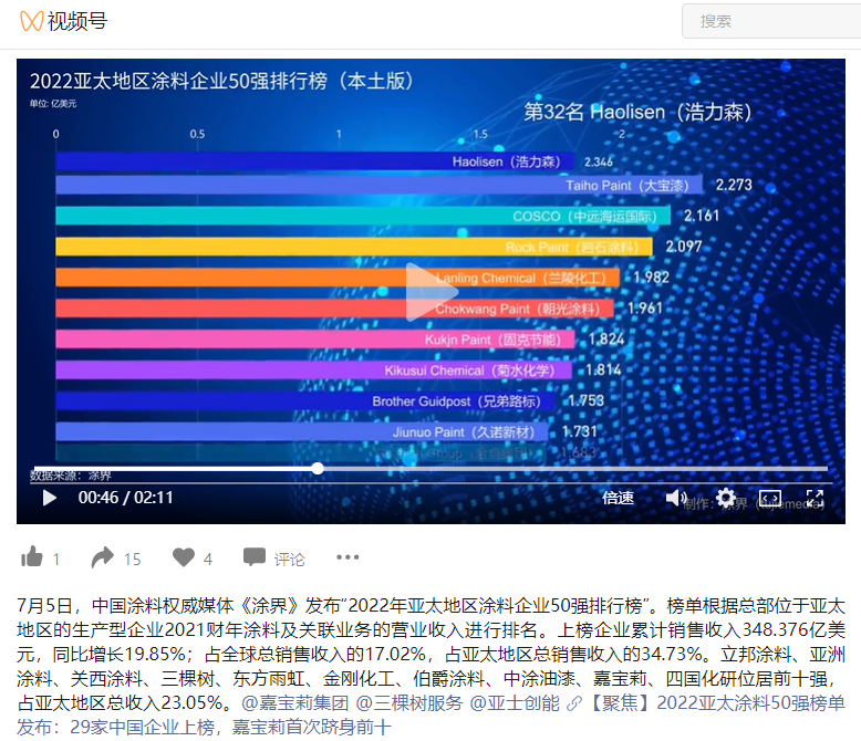 2022亞太地區(qū)涂料企業(yè)50強(qiáng)排行榜正式發(fā)布——浩力森居排行榜第32名