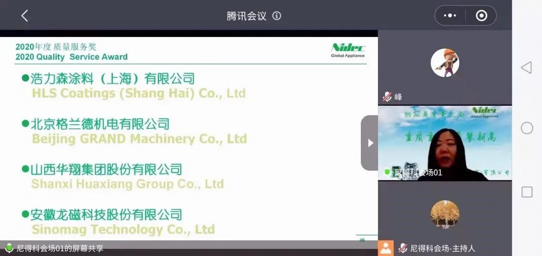 2021年1月,尼得科壓縮機(jī)(北京)有限公司舉行了"2020年度供應(yīng)商質(zhì)量大會(huì)",由于疫情影響,為了響應(yīng)國家號召,避免人員聚集,此次大會(huì)采用線上直播形式,全球各地的優(yōu)秀經(jīng)銷商代表、優(yōu)秀供應(yīng)商、以及其他相關(guān)部門工作人員等共同參與了此次直播。浩力森涂料榮獲了尼得科壓縮機(jī)“質(zhì)量服務(wù)獎(jiǎng)”,載譽(yù)而歸。