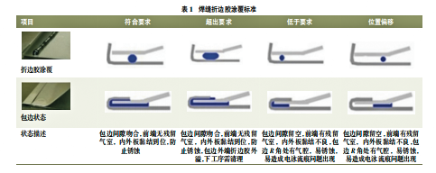 3)拆解車折邊膠狀態(tài):現(xiàn)場(chǎng):查拆解車折邊膠狀態(tài),折邊膠僅在內(nèi)外板內(nèi)側(cè),包邊及R角處無膠。標(biāo)準(zhǔn):如圖表1所列。