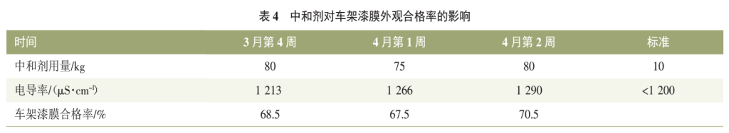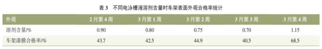 現(xiàn)場電泳槽液溶劑含量雖在工藝要求范圍內(nèi),但是整體偏低,提高溶劑含量可以明顯降低電泳漆膜外觀缺陷的發(fā)生率。2021年3月第4周一次性補加600kg溶劑,提高溶劑含量0.3%,漆膜外觀問題明顯改善,車架漆膜合格率由40%提升至68%。