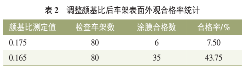 電泳涂裝的顏基比指電泳漆、槽液或漆膜中的顏料與基料(樹脂)之比,電泳槽液和新配的電泳原漆槽液顏基比應(yīng)是相同的,但在電泳過程中,顏料和樹脂不定按照原配比沉積到被涂物上,因而產(chǎn)生槽液、漆膜和原漆三者的顏基比不相同的現(xiàn)象,電泳槽液顏基比失調(diào)易產(chǎn)生縮孔粗糙、失光等漆膜弊病,影響漆膜性能,因此需要定期檢測槽液顏基比,按檢測結(jié)果添加乳液或色漿調(diào)整槽液的顏基比。電泳槽液顏基比技術(shù)要求在0.14~0.20范圍內(nèi),按照Q/JQ11219.4《涂料灰分、顏基比測定方法》進行檢測,顏基比雖在工藝要求范圍內(nèi),但是在明顯升高,通過調(diào)整顏基比范圍,使其降低至0.165左右,發(fā)現(xiàn)車架外觀糙合格率由7.5%提升至43.75%(見表2),故顏基比失調(diào)為電泳漆膜外觀的主要影響因素。