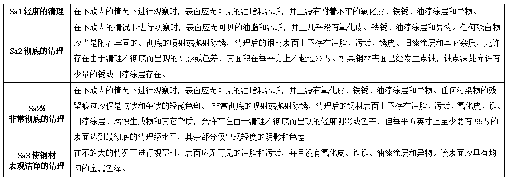 重要涂裝面除銹等級(jí):≥Sa2.5(A面);一般涂裝面除銹等級(jí):≥Sa2(B面、C面);被噴涂表面無灰塵、油及其它雜質(zhì)。標(biāo)準(zhǔn)參考ISO-8501-1。達(dá)到Sa 2-2.5級(jí);密度85%以上;表面粗糙度在25-40um之間;在不使用放大鏡的情況下觀察出來的任一個(gè)經(jīng)過近出白金屬噴砂清理的表面,應(yīng)無任何可見的油漬、油脂、灰塵、污垢、氧化皮、鐵銹、膜層、氧化物、腐蝕物,以及其它外來物質(zhì)。